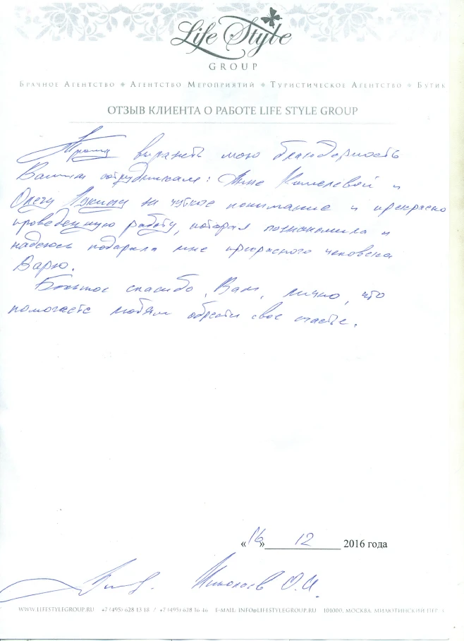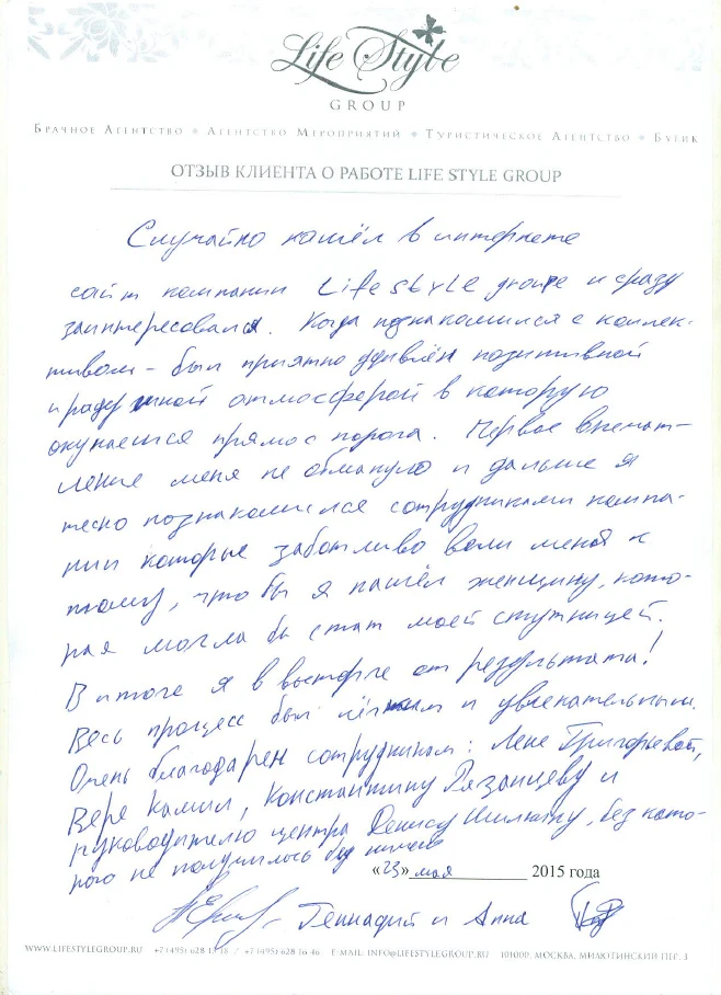 Life Style Group – современная компания свадебной индустрии, отличающаяся от существующих служб знакомств и брачных агентств, собственными эффективными методиками и технологиями, созданными на основе российского и международного опыта в области семейной психологии и коучинга, детальным анализом запросов каждого Клиента и современного рынка услуг, регулярным контролем качества и динамичностью, а также строгой приверженностью к высокими стандартам сервиса, которые позволяют нам быть впереди и превосходить ожидания Клиентов!
